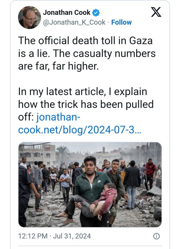 1. Every Israeli knows exactly what is going on in Gaza – after all, their children-soldiers keep posting videos online showing the latest crimes they have committed, from blowing up mosques and hospitals to shooting randomly into homes. Polls show all but a small minority of Israelis approve of the savagery that has killed many tens of thousands of Palestinians, including children. A third of them think Israel needs to go further in its barbarity.