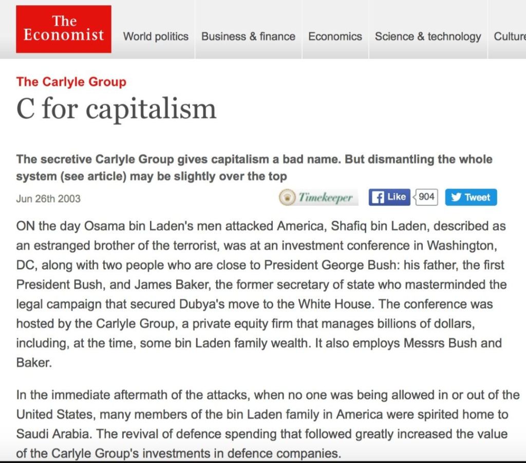 The bin Laden – Bush Carlyle Group meeting was also confirmed by The Economist in a June 2003 article entitled C- for Capitalism (see screenshot below):