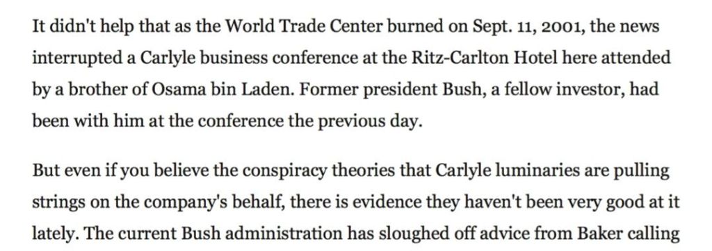 “ON the day Osama bin Laden’s men attacked America, Shafiq bin Laden, described as an estranged brother of the terrorist, was at an investment conference in Washington, DC, along with two people who are close to President George Bush: his father, the first President Bush, and James Baker, the former secretary of state who masterminded the legal campaign that secured Dubya’s move to the White House. The conference was hosted by the Carlyle Group, a private equity firm that manages billions of dollars, including, at the time, some bin Laden family wealth. It also employs Messrs Bush and Baker.