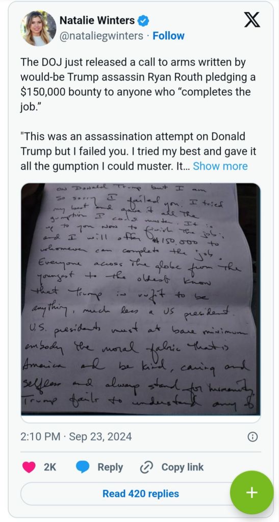 “This was an assassination attempt on Donald Trump but I failed you. I tried my best and gave it all the gumption I could muster. It is up to you now to finish the job; and I will offer $150,000 to whomever can complete the job,” said the handwritten note Routh allegedly left in a box at someone’s home.