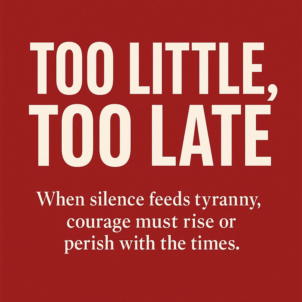 It was in this very season that the phrase “Too little, too late” was coined, to capture the poverty of courage and creative leadership, the lack of combat readiness, men and materials to face the rampaging hordes of outright fascistic terrorism. Just as it is now in our dear nation.
